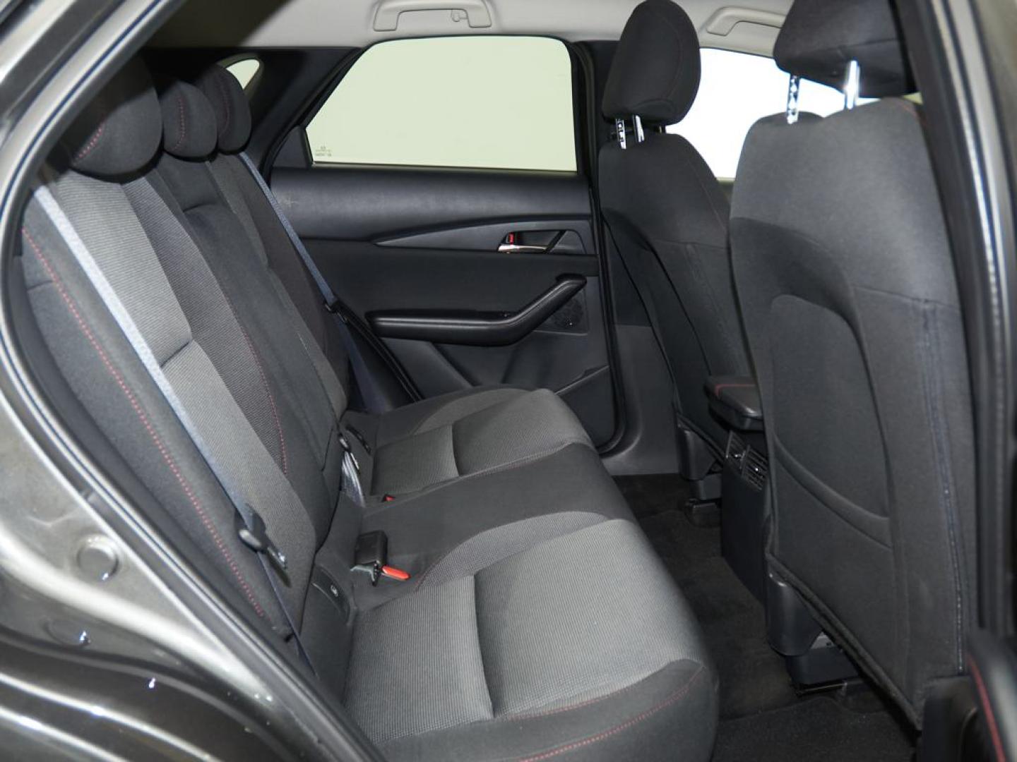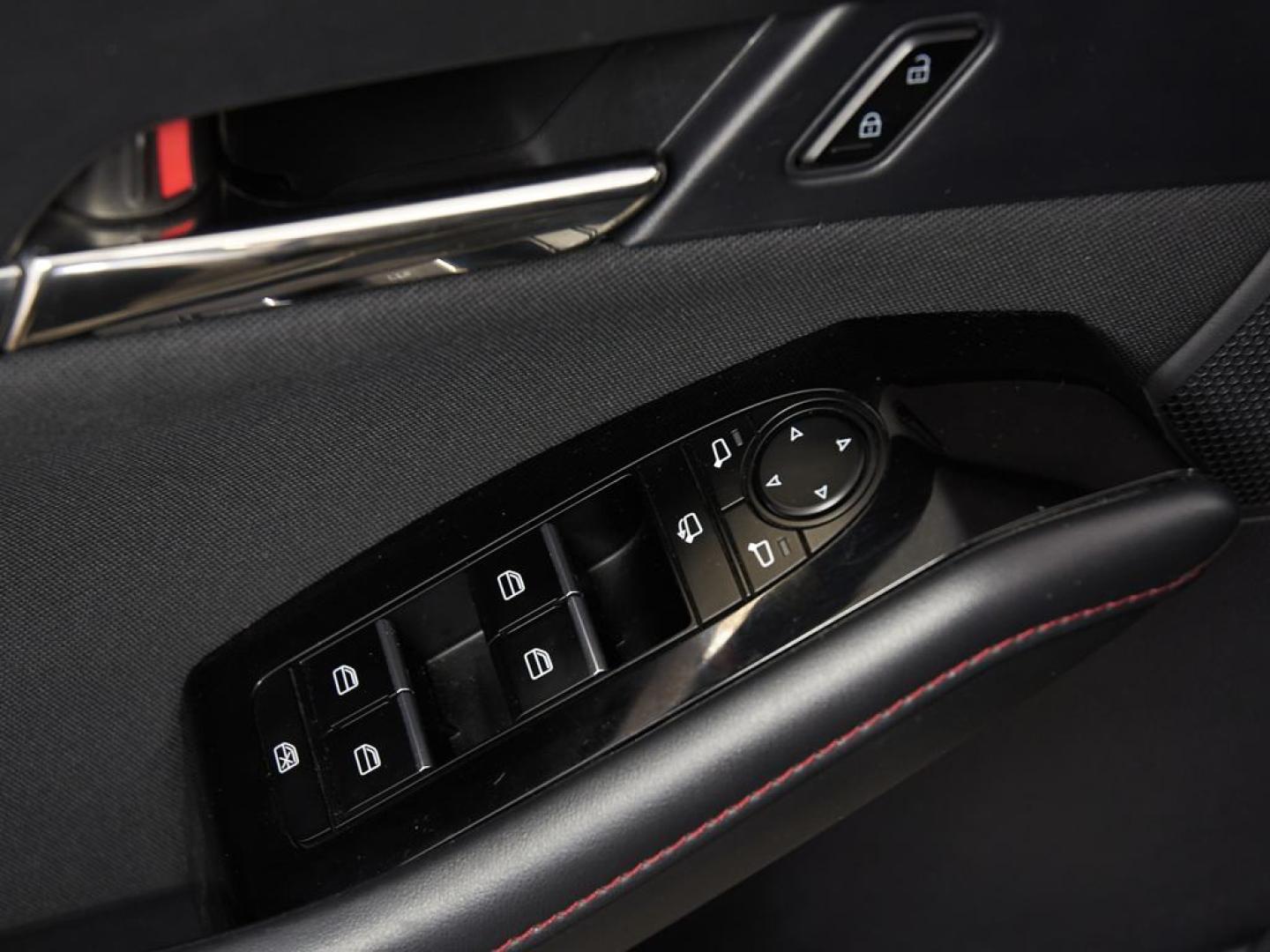 - Tapiceria de tela negra con costuras en rojo en asientos, salpicadero y reposabrazos